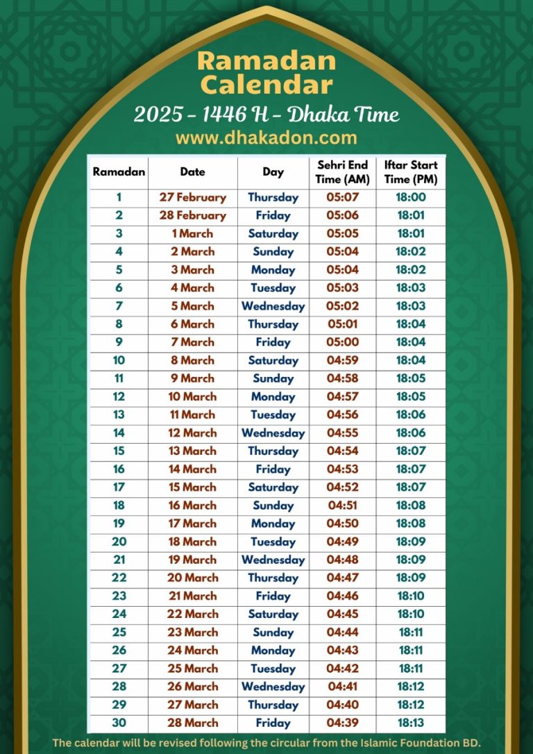 Ramadan Timetable 2025 Bangladesh