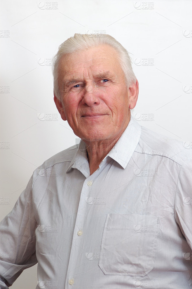 Serious Portrait Of A 70 Year Old Man With Brown Hair And Blue Eyes On